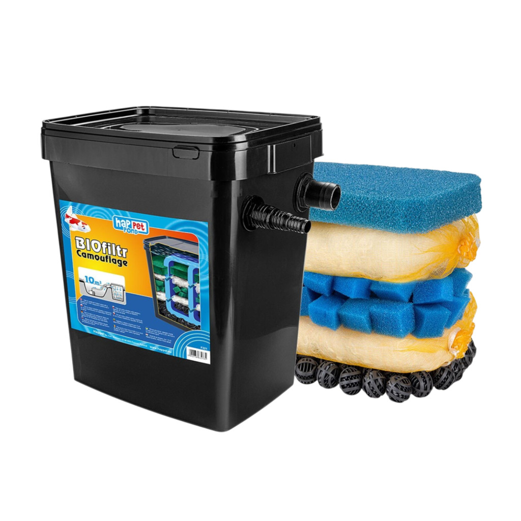 A Happet BIOFilter Camouflage tószűrő egy komplett szűrőrendszer, amely kisebb kerti tavak víztisztítására készült. A szűrő különlegessége, hogy a víz be- és kimeneti csatlakozása a felső részen található, így a készülék részben a talajba süllyeszthető. Ennek köszönhetően a szűrő a tó környezetében szinte észrevétlen marad, miközben hatékonyan tisztítja a vizet.
