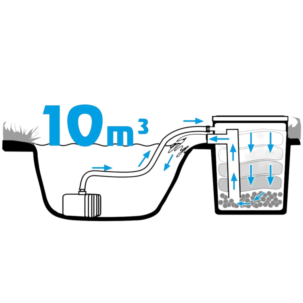 A szűrő több rétegben elhelyezett szűrőanyagok segítségével tisztítja a tó vizét. A víz először mechanikai szűrésen halad át, ahol a lebegő szennyeződések fennakadnak a szivacson, szűrőgyapjún és japán szűrőanyagon. Ezután a biológiai szűrés során a hasznos baktériumok lebontják a káros anyagokat, így biztosítva a víz stabil biológiai állapotát.