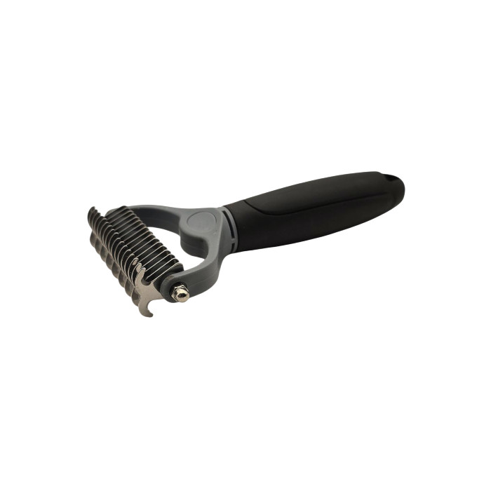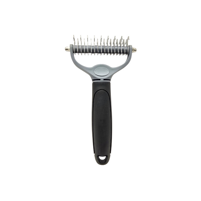 A fésű kétoldalas kialakítással rendelkezik, így az egyik oldalon sűrűbb (5 mm), a másikon ritkább (1 cm) pengesor található. Ennek köszönhetően ideális mind a durvább bontáshoz, mind a finomabb igazításhoz. A könnyű, műanyag nyél kényelmes fogást biztosít, így hosszabb szőrápolási folyamat alatt is könnyen használható.