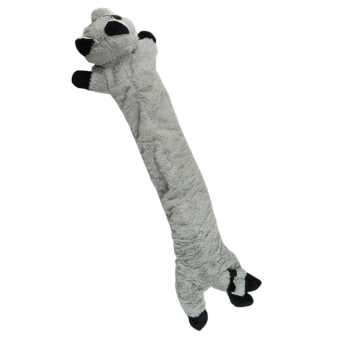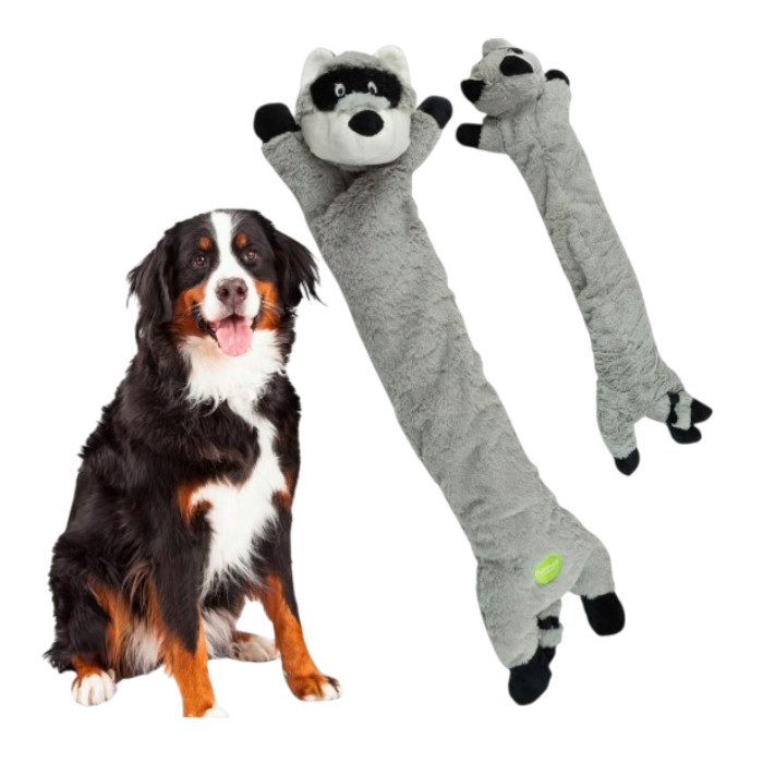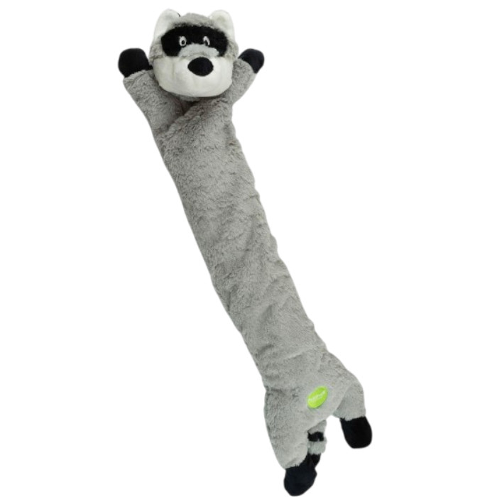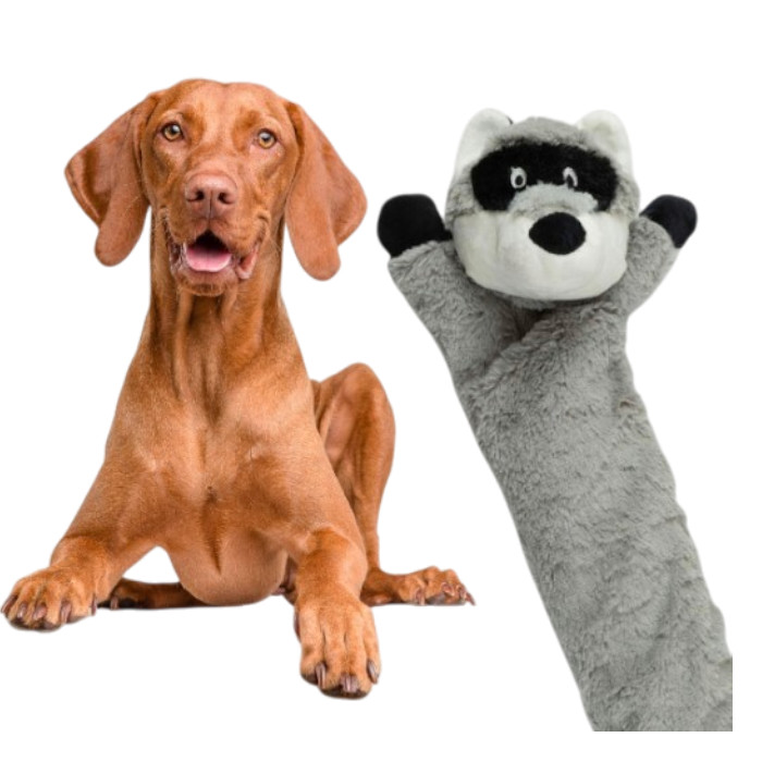 A vidám, hosszúkás kialakítású plüss mosómedve három sípolóval és zörgő papírtöltettel készült, hogy minden játék izgalmas és