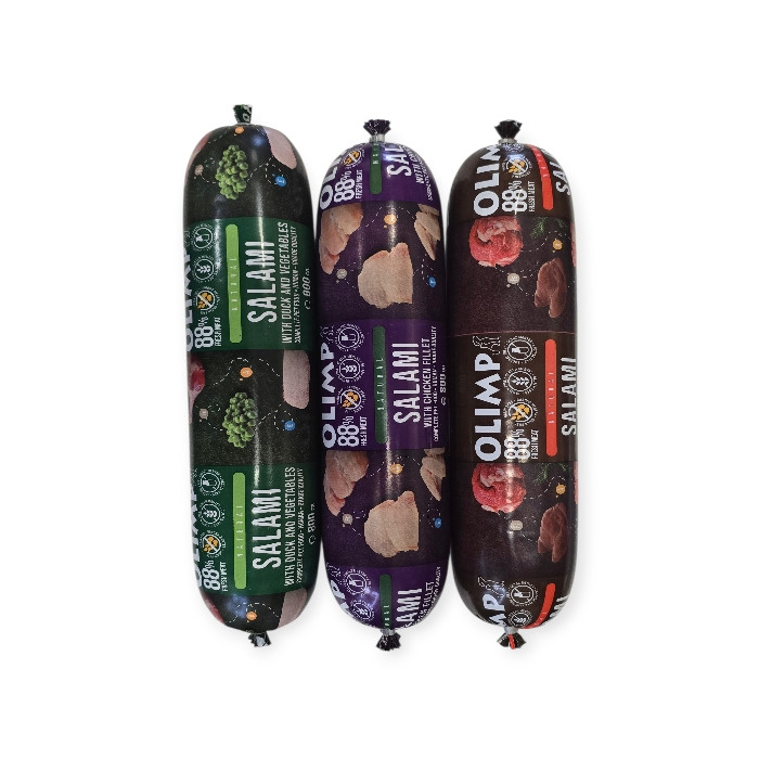 Az Olimp marhás szalámi kiegyensúlyozott analitikai összetétellel rendelkezik, mesterséges túlterhelés nélkül kínál megbízható, ízletes megoldást. A nagy, 800 g-os kiszerelés gazdaságos választás rendszeres jutalmazáshoz vagy több kutyás háztartás esetén.