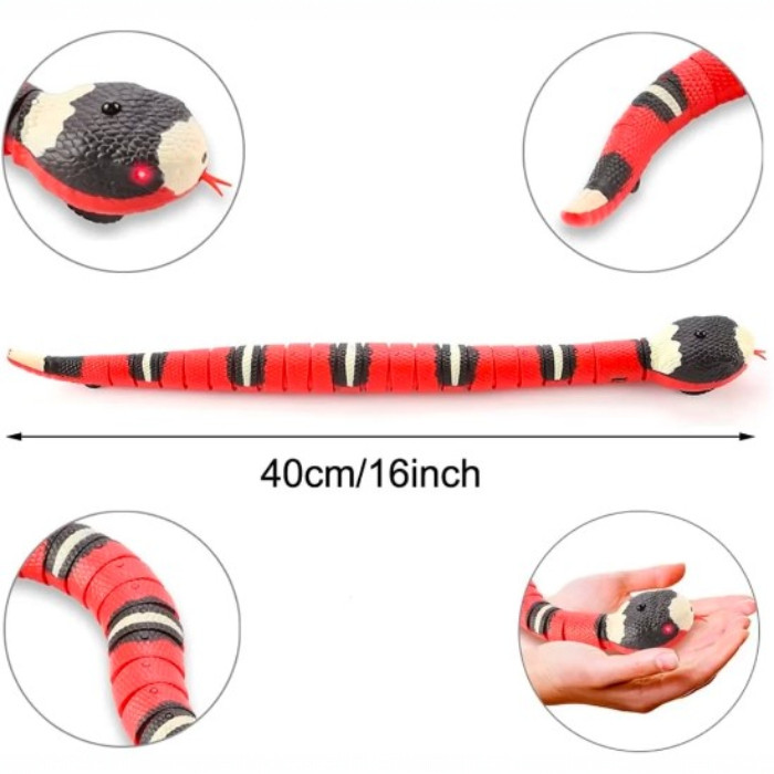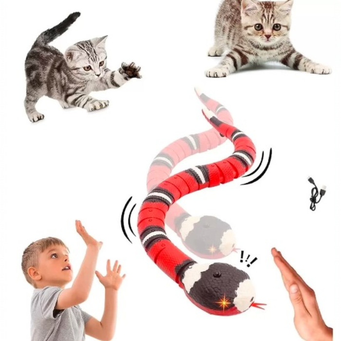 A kígyó élethű kanyargó mozgása azonnal felkelti a figyelmet, és hosszú ideig leköti a különböző állatokat – cicát, kistestű kutyát, vadászgörényt, nyuszit, sünit vagy akár más lakásban tartott kisállatot is.