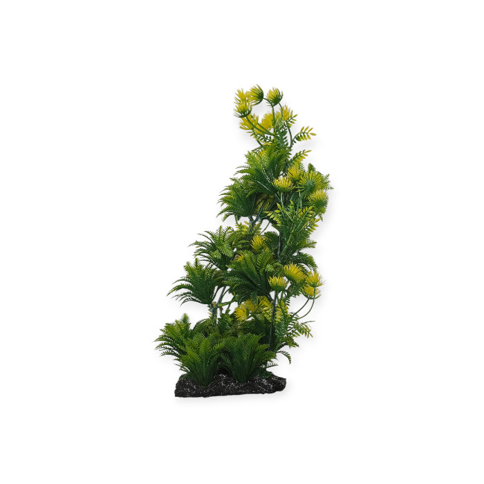 A növény erős, fekete műgyanta talppal rendelkezik, amely stabilan a helyén tartja a dekorációt, így nem billeg és nem úszik fel. Teljesen biztonságos anyagból készült, nem bocsát ki káros anyagokat és nem változtatja meg a víz kémiáját. A sárgászöld árnyalatú levelek friss, élénk megjelenést biztosítanak, és jól mutatnak édesvízi akváriumokban, középtérben vagy háttérben elhelyezve.